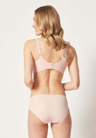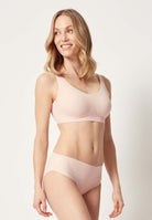 Thanks to the innovative cut and interlock finish, this soft bra is also ideal for breast prosthesis wearers. To do this, simply carefully cut the opening for the removable pad a little larger and insert the breast prosthesis. The underbust area is very supple due to the seamless and soft cut and still provides good support without exerting pressure on sensitive tissue, such as scar tissue.