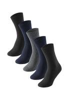 Consisting of 2 midnight blue pairs of socks, 1 mottled gray and 2 black pairs.