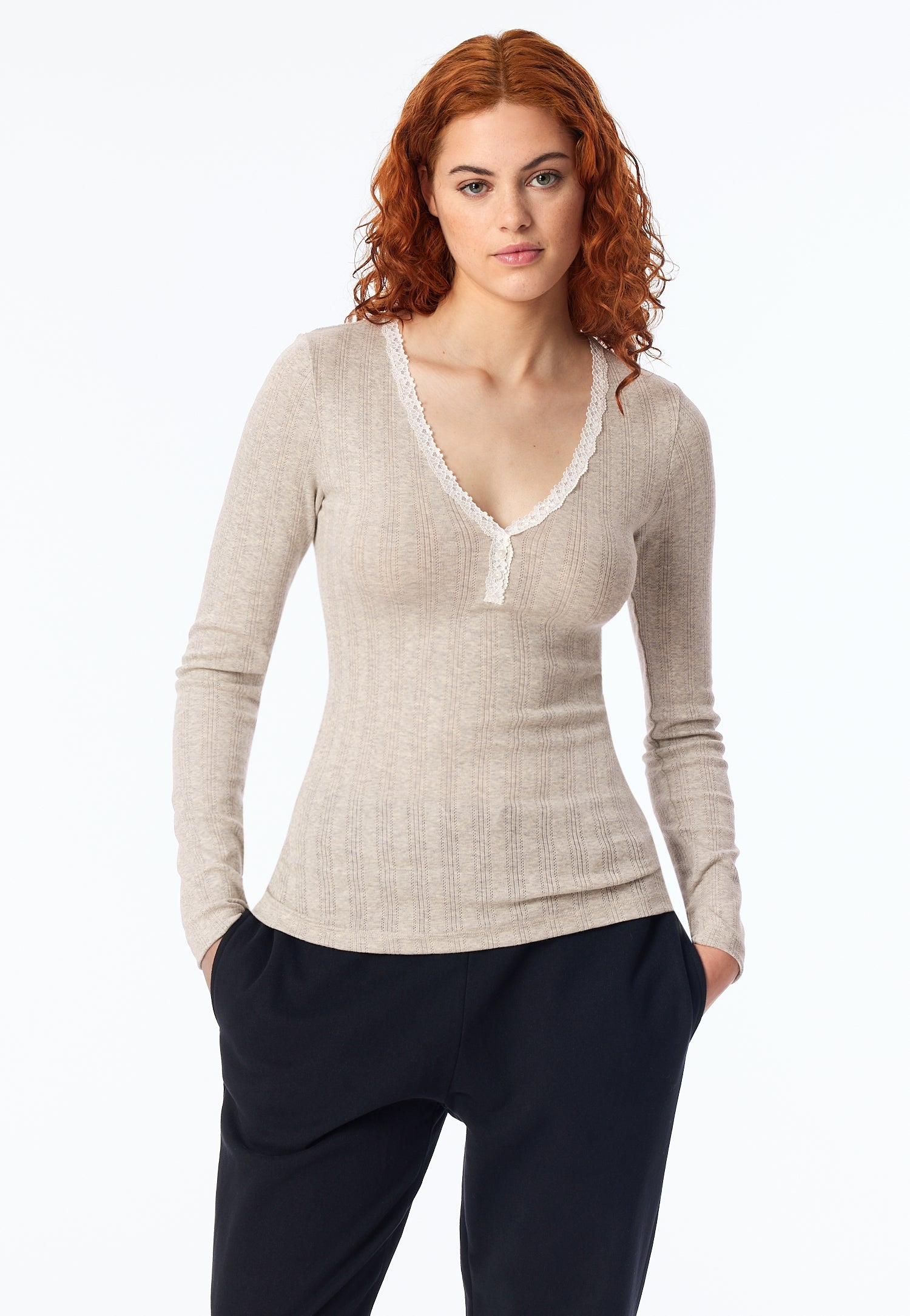 • Body-hugging cut with V-neck